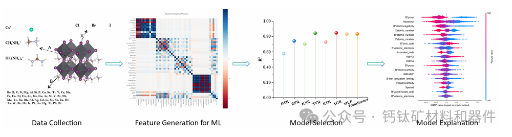 该研究直接解决了钙钛矿光伏开发中的一个关键瓶颈:需要更快、更经济高效地识别稳定、无铅和高效的材料。传统上,这种筛选依赖于高通量实验或密度泛函理论(DFT)模拟—既费力又耗能。该团队的机器学习方法由 Yucheng Ye、Runyi Li 和 Bo Qu 领导,在数千种卤化物钙钛矿候选物中取得了强大的预测性能(R² > 0.80,MAE < 0.29 eV)。