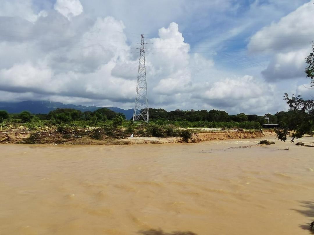从现场情况来看,浑浊泛黄的洪水水位高涨,湍急的水流不断冲击河岸,沙琅江堤岸已出现坍塌,大量泥沙、杂物被裹挟而下。那座高耸的输电铁塔,虽仍坚定矗立,但周边土体因洪水浸泡、冲刷,稳定性大打折扣,一旦堤岸进一步坍塌,铁塔基础恐受影响,进而威胁整条输电线路的安全运行。