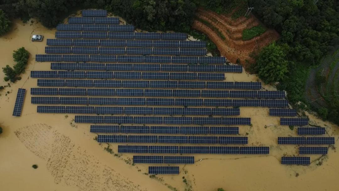 通过无人机拍摄的画面可以看到,该光伏电站所处区域已被洪水大面积覆盖,原本整齐排列的光伏板,如今大半浸没在泛黄的洪水里,只露出部分板面。洪水还冲倒了一些光伏支架,周边的树木也在洪水中摇摇欲坠。