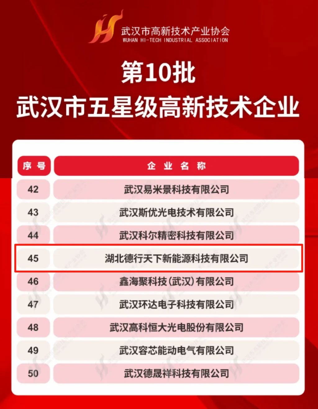 近日,武汉市高新技术产业协会公布第十批武汉市五星级高新技术企业名单,湖北德行天下新能源科技有限公司凭借在新能源领域的技术创新实力与行业影响力成功入选。此次评选全市仅50 家企业上榜,依据《武汉市高新技术企业创新能力评价标准》,从科研实力、创新效能、团队建设、发展潜力、行业地位五个维度综合评定,代表着武汉高新技术企业的最高水准。
