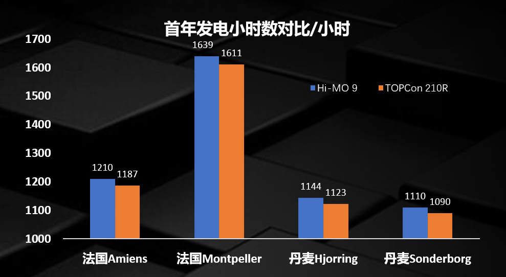 测算数据显示,在首年发电时数对比中, BC组件Hi-MO 9以更强大的弱光发电优势,在法国项目中的发电时长分别高达1210小时和1639小时,而对应的TOPCon组件为1187、1611小时;另一组在丹麦电站的产品,Hi-MO 9依然比TOPCon产品高出21小时、20小时的等效发电时长,整体发电效果优势显著,效能强劲。