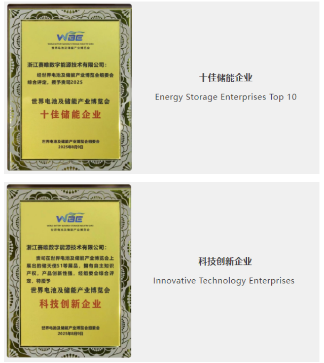 在展会同期举办的颁奖晚宴上,赛唯数字能源凭借在储能领域的突出贡献与创新实力,荣获由世界电池及储能产业博览会组委会颁发的 “十佳储能企业” 和