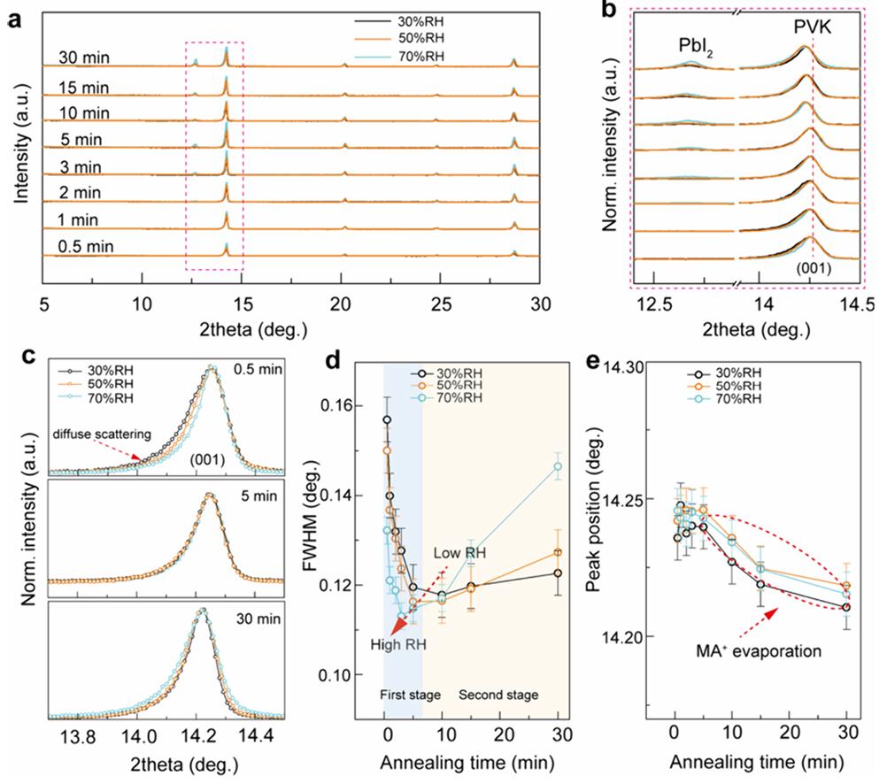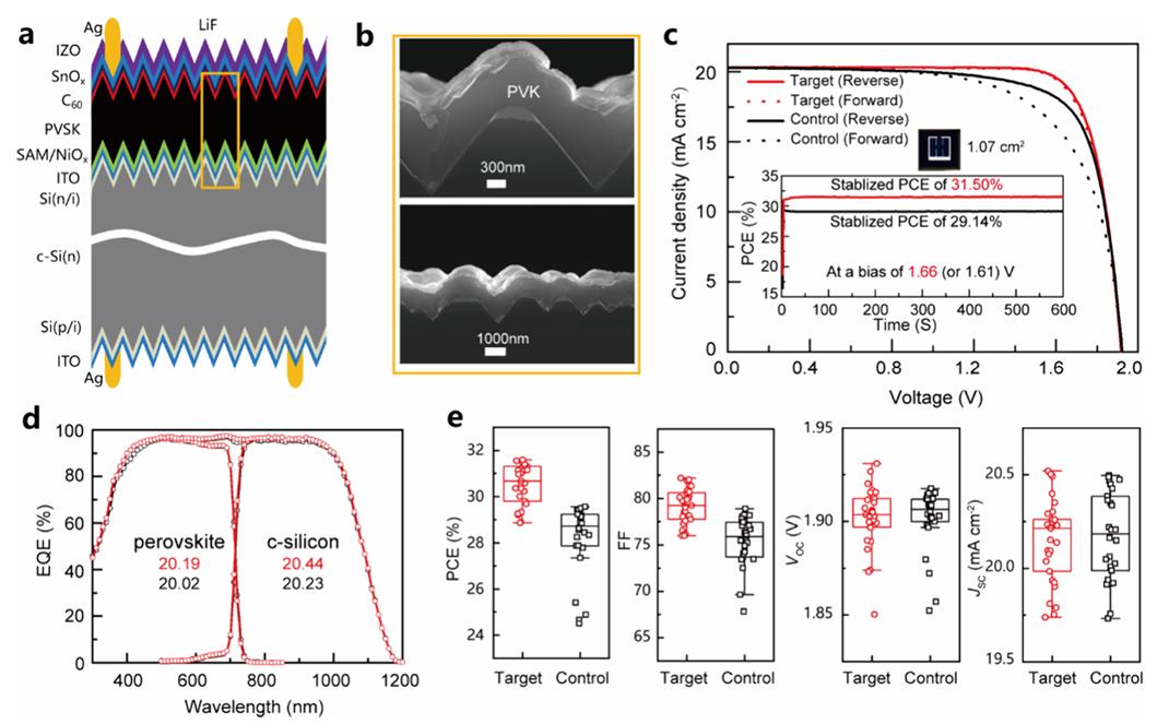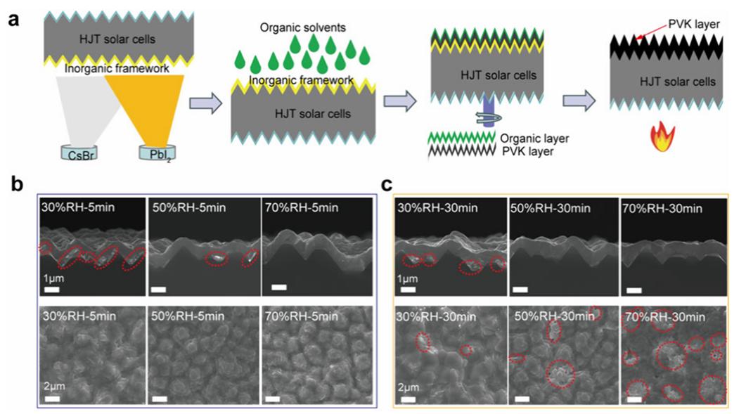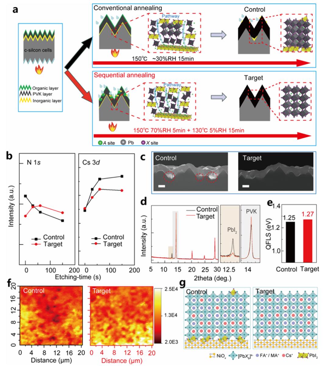 绿色电力作为全球能源低碳转型的核心路径,其中光伏发电在装机总量和年增长率方面均保持领先地位。随着电站系统成本(包括土建和人工等非组件成本)的持续攀升,业界对具有更高转换效率和功率输出的钙钛矿/硅叠层太阳能电池技术给予了高度期待,将其视为下一代光伏技术的关键突破口。制备叠层电池的技术关键是如何在晶硅子电池表面实现高质量钙钛矿成膜,为了与全制绒的商业晶硅电池相兼容,通威采用了蒸镀—溶液两步法成膜技术路线,但是两步沉积宽带隙钙钛矿薄膜难以兼顾反应充分、成分均匀、绒面保型和结晶度高,限制了该路线叠层电池的效率。针对蒸镀-溶液两步法技术的上述难题,通威钙钛矿团队系统研究了钙钛矿相转变的中间过程,揭示了宽带隙钙钛矿结晶动力学机理,解耦了反应过程中湿和热等外界条件对钙钛矿薄膜结晶和降解的多重作用机制及平衡工艺条件,并创新提出了一种简单而有效的顺序结晶调制策略,通过可量产的工艺和设备在全制绒商用硅基底上制备了成分均匀且缺陷减少的钙钛矿薄膜,实现了光电转换效率达