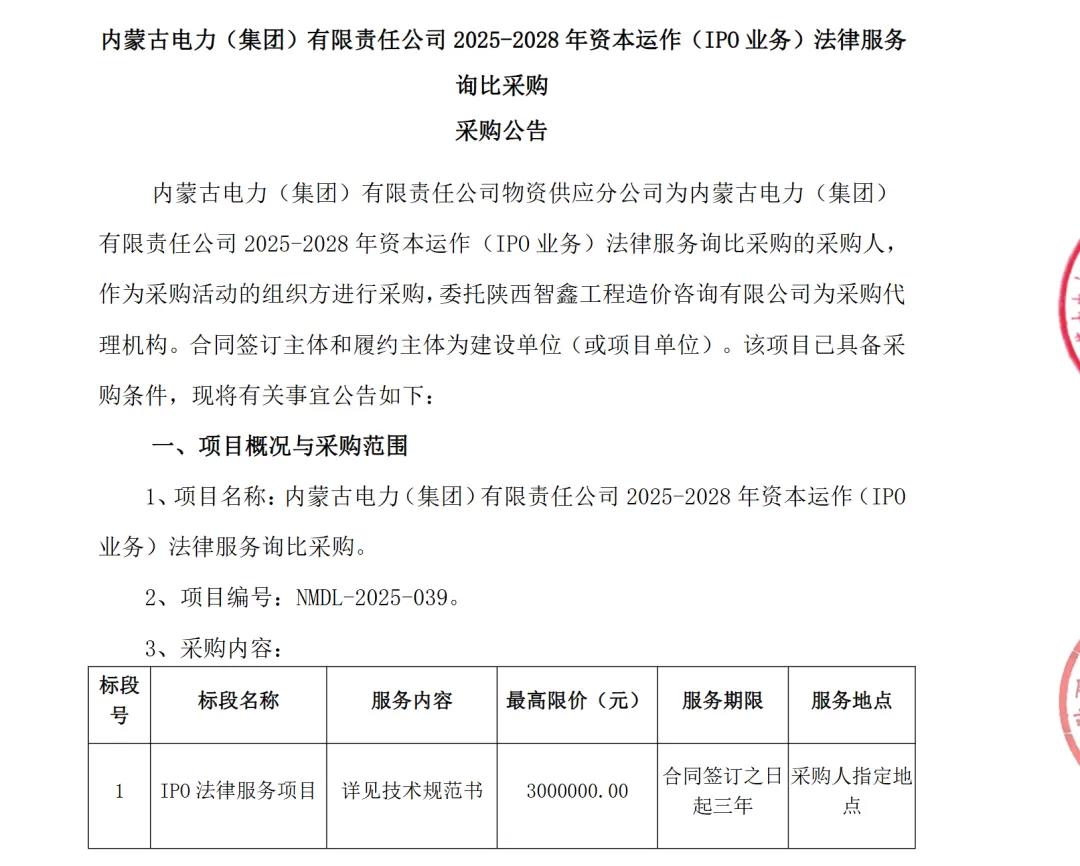 据了解,2025年5月28日,内蒙古电力集团发布《2025-2028年资本运作(IPO业务)法律服务询比采购公告》,明确计划启动IPO,并拟采购法律服务,服务期限为三年,最高限价300万元。