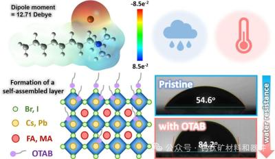 两亲性分子OTAB在3D CsFAMA钙钛矿薄膜上形成自组装层,增强器件性能和长期稳定性。图片来源:Chemical Engineering Journal