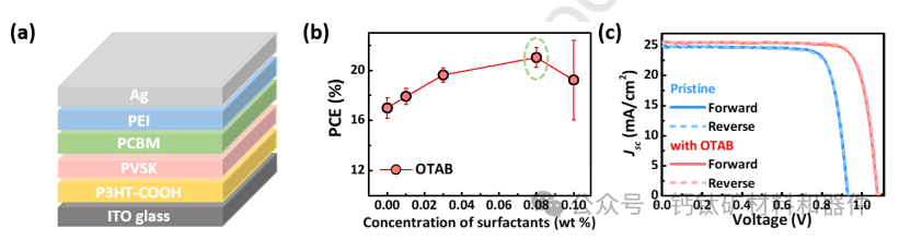因此,基于 OTAB 的器件表现出卓越的性能,实现了 22.61% 的功率转换效率(PCE),短路电流密度(Jsc)为 25.36 mA/cm2,开路电压(Voc)为 1.10 V,填充因子(FF)为 81.36 %。