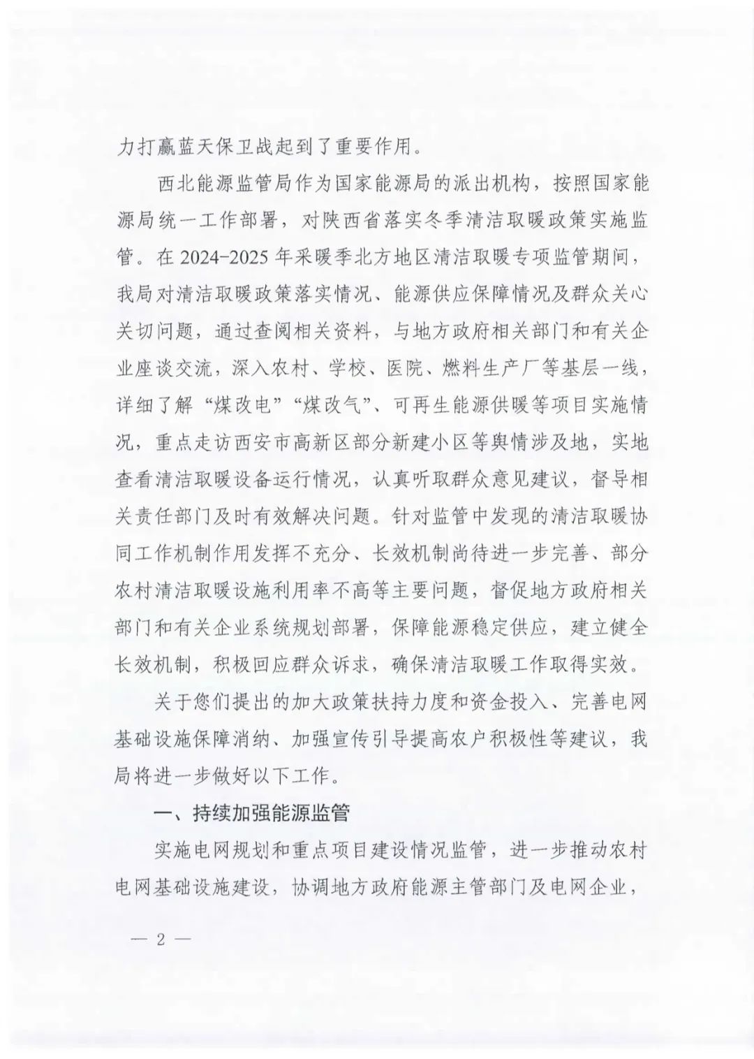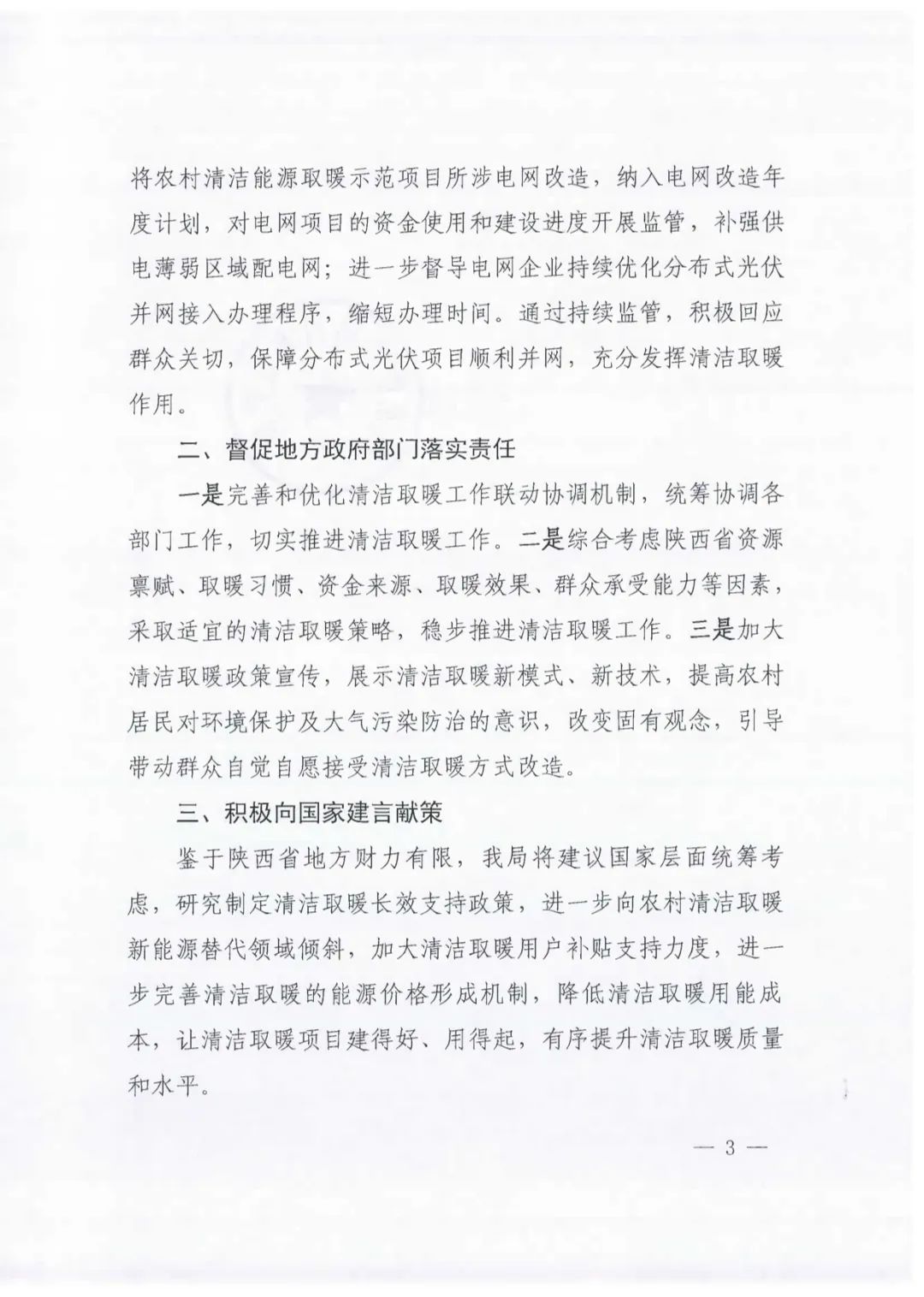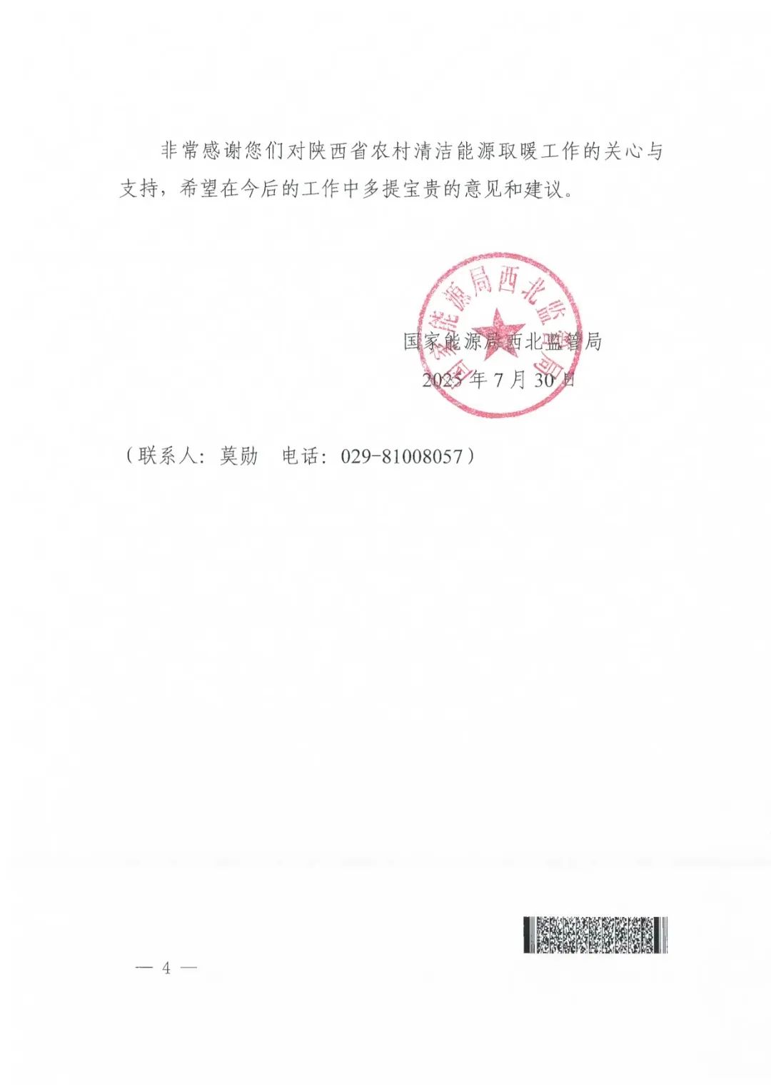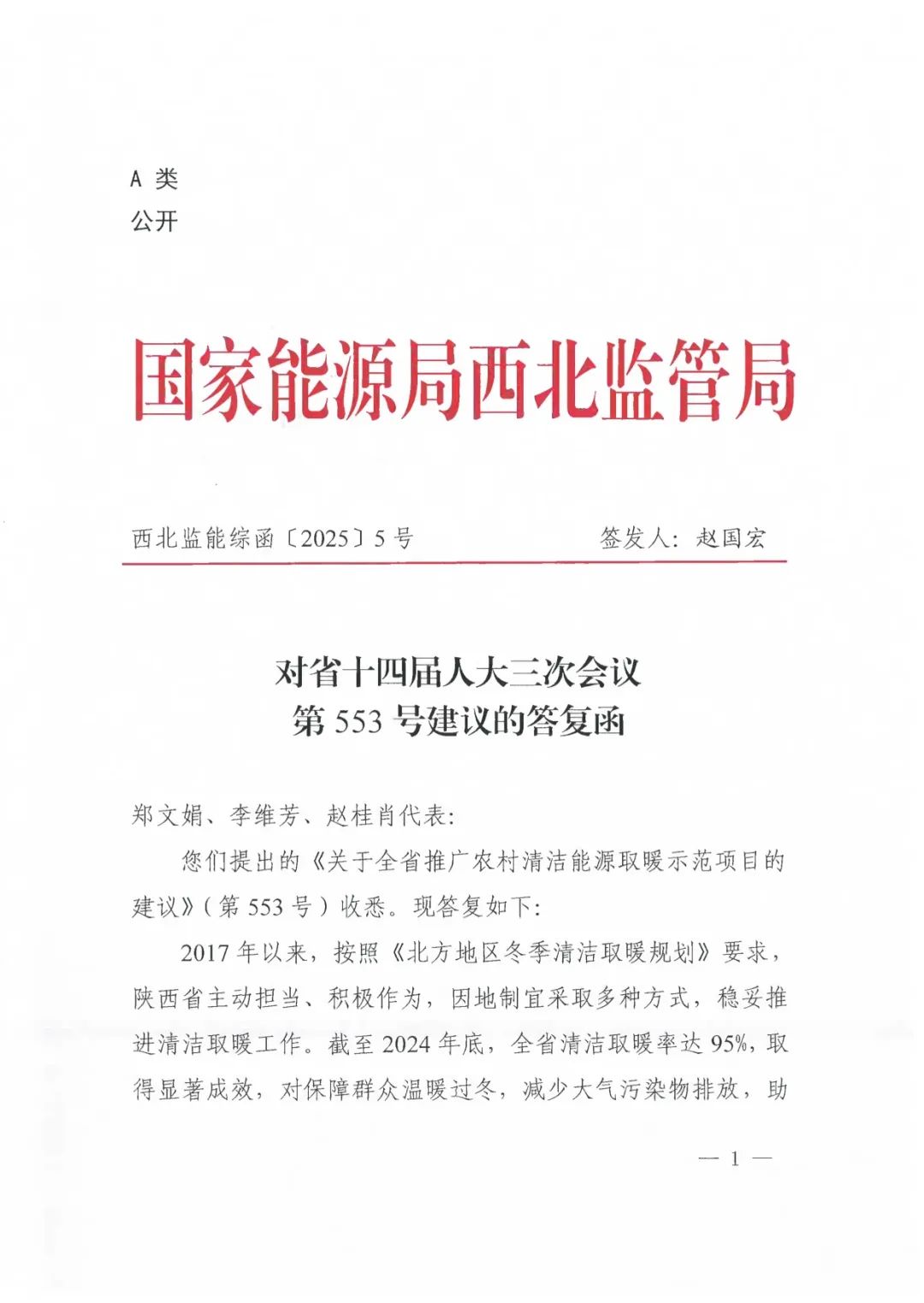 近日,国家能源局西北监管局发布对省十四届人大三次会议 第553号建议的答复函。其中提到,完善和优化清洁取暖工作联动协调机制,统筹协调各部门工作,切实推进清洁取暖工作。综合考虑陕西省资源禀赋、取暖习惯、资金来源、取暖效果、群众承受能力等因素,采取适宜的清洁取暖策略,稳步推进清洁取暖工作。加大清洁取暖政策宣传,展示清洁取暖新模式、新技术,提高农村居民对环境保护及大气污染防治的意识,改变固有观念,引导带动群众自觉自愿接受清洁取暖方式改造。