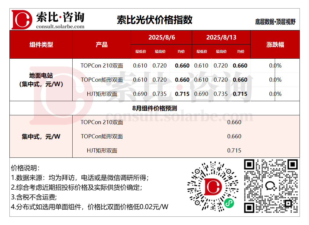 本周组件价格不变。地面电站TOPCon210双面0.660元/W,TOPCon矩形双面0.660元/W,HJT矩形双面0.715元/W。