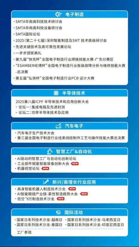 在AI终端、图像传感、半导体芯片等关键领域持续领跑,成功实现技术创新与多场景应用的深度融合。NEPCON ASIA 2025针对具身智能机器人、低空飞行、智能工厂、机器视觉、半导体、电子制造等领域开展40场会议论坛及赛事活动,深度整合国内外行业协会组织、专家、科研人员、资深从业者、行业应用终端及行业媒体等资源,探讨电子制造现状与未来发展趋势,实现业务的持续增长,共同拓展市场新未来!