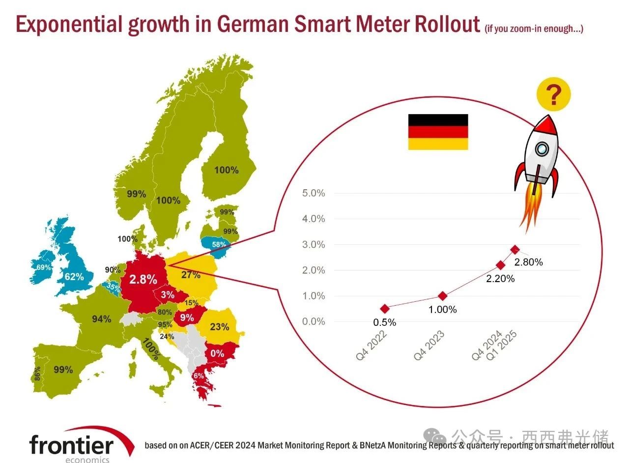 德国,作为欧洲工业强国和能源转型的倡导者,却在一个关键领域——智能电表(Smart Meter)的推广上,陷入了令人费解的困境。截至2025年3月31日,德国的智能电表普及率仅为 2.8%,这一数字与瑞典、丹麦、意大利的接近100%、西班牙和挪威的99%、法国的94%以及英国的62%相比,形成了难以置信的差距。这种滞后不仅可能耗费数十亿欧元的额外成本,更严重的是,它正在成为拖慢整个国家能源转型进程、削弱电网稳定性的核心障碍。