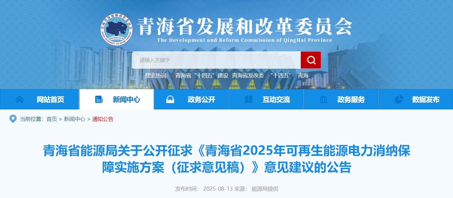 国家能源局综合司《关于2025年可再生能源电力消纳责任权重及有关事项的通知》(发改办能源〔2025〕669号),结合我省实际,我局研究起草了《青海省2025年可再生能源电力消纳保障实施方案(征求意见稿)》,并在征求省相关部门意见建议的基础上作了修改完善,现进一步面向全社会公开征求意见,欢迎社会各界踊跃参与,积极建言献策。