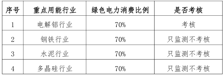 (二)省能源局会同省发展改革委等相关部门,制定我省绿色电力消费比例分解方案,确定重点用能行业企业清单。对全省承担消纳责任的各市场主体明确最低消纳责任权重,对电解铝行业消纳量完成情况进行考核,对钢铁行业、水泥行业、多晶硅行业消纳量完成情况进行监测。