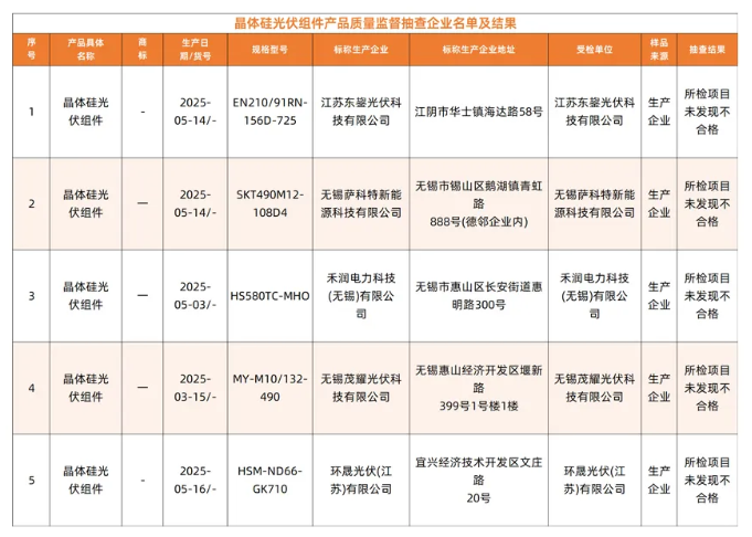 2025年度,无锡市场监督管理局对晶体硅光伏组件产品质量进行了监督抽查。共抽查产品5批次,未发现不合格。