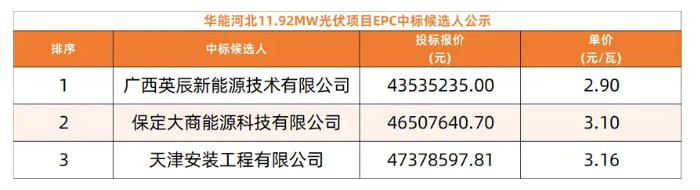 8月15日,华能华北分公司华能泰乐芦台东方诚二期11.92MW光伏发电项目EPCT程中标候选人公示,招标人为华能泰乐(唐山)绿色能源有限公司项目直流侧装机容量15012.15kWp,广西英辰新能源技术有限公司以2.9元/瓦位列第一候选人。计划工期:本工程(批复容量)自合同签订之日起,于30日内全容量并网投产开工日期以招标人通知为准,具体开工日期以监理发出的开工通知书为准。