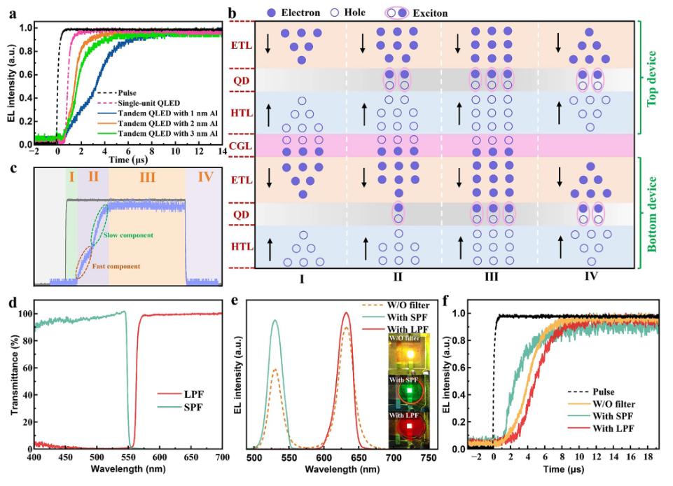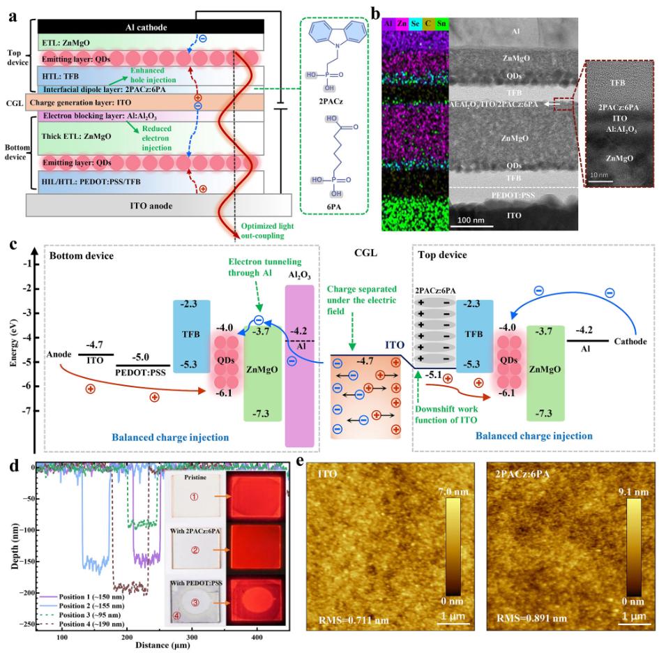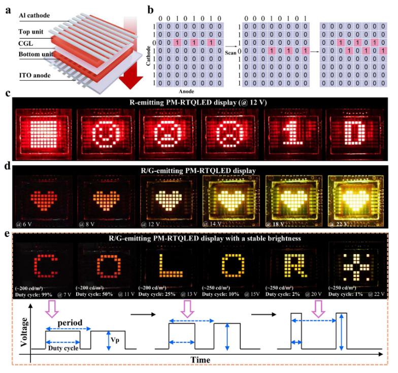 尽管单结量子点发光二极管(QLEDs)在效率和稳定性方面已取得显著进展,但常规结构的串联QLEDs性能仍远落后于倒置结构。本研究广西大学张恒等人通过引入超薄(≈4 nm)氧化铟锡(ITO)电荷生成层(CGL),并结合2PACz:6PA界面偶极层(IDL)和Al-Al₂O₃电子阻挡层(EBL),系统优化了电荷注入平衡与光提取效率。最终,常规串联QLEDs实现了创纪录的51.2%外量子效率(EQE)、31,383小时(1000 cd/m²下)的超长寿命(T₉₅)以及2.8 V的超低开启电压。得益于其快速响应(≈4.8 µs),研究团队首次成功制备了8×8无源矩阵显示面板,可稳定呈现无闪烁的静态或动态色彩图像。这一成果为QLED在下一代显示和照明领域的商业化应用铺平了道路。