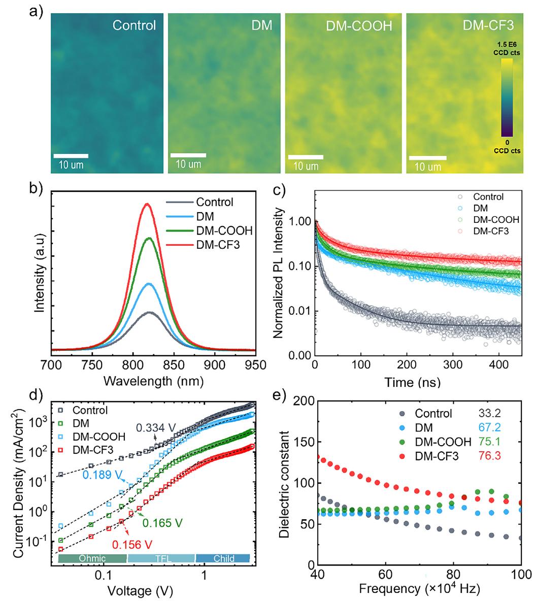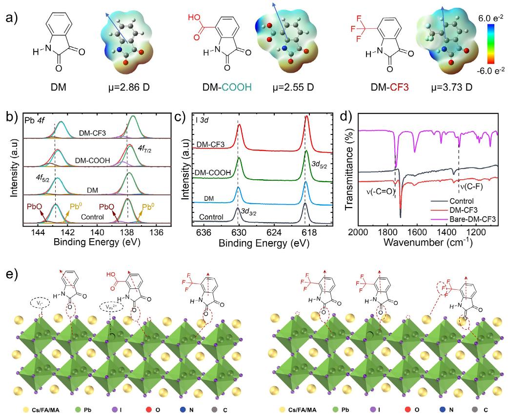 多机制协同钝化:DM-CF₃的C=O基团钝化未配位Pb²⁺,-CF₃基团通过卤键稳定有机阳离子并增强疏水性,双重作用降低缺陷密度至5.28×10¹⁵ cm⁻³。