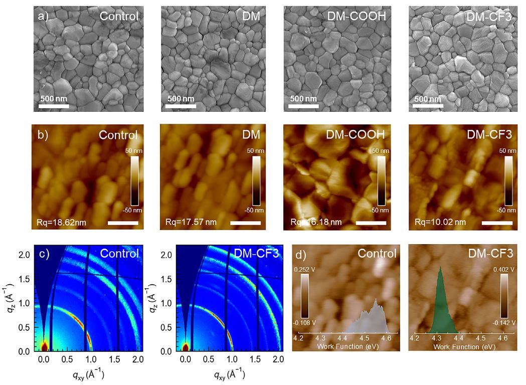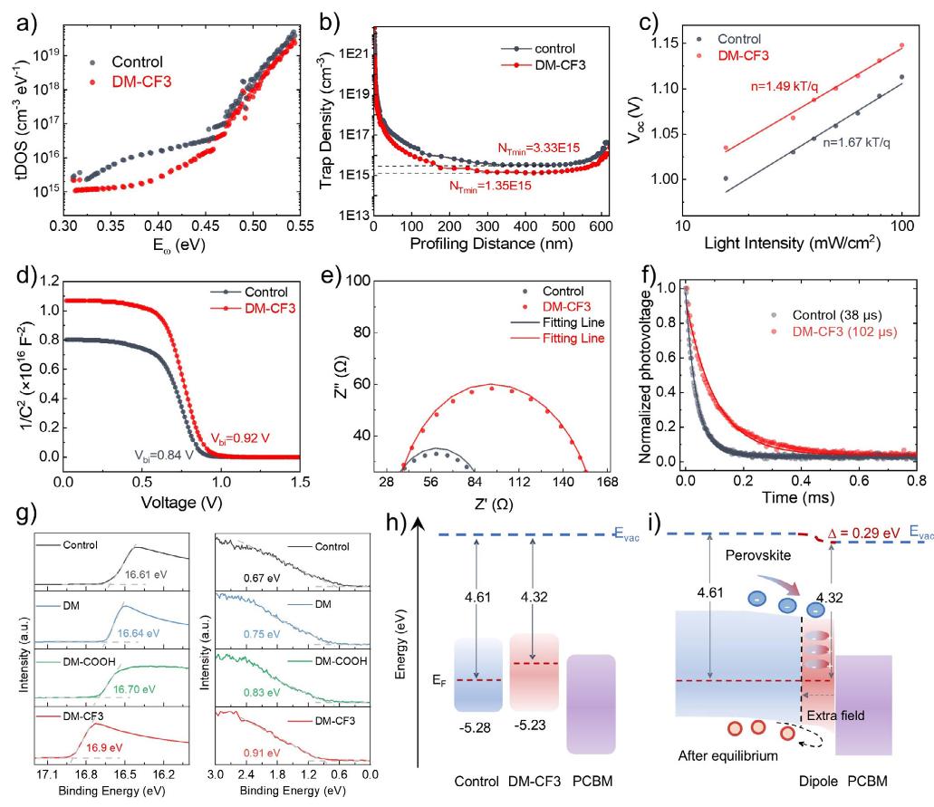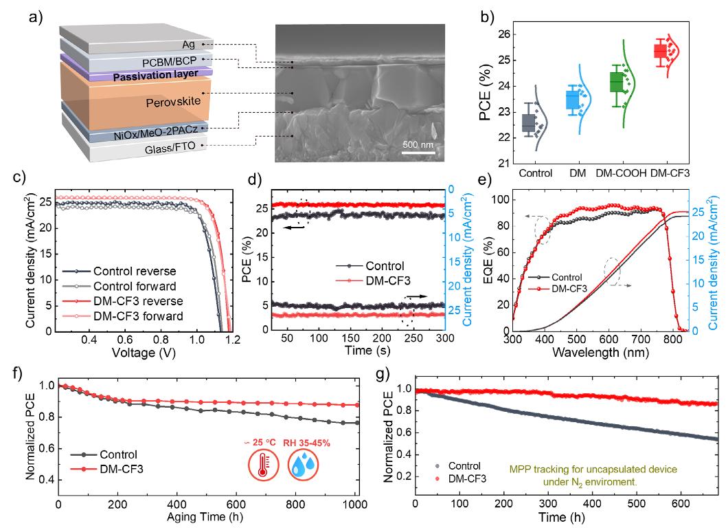 偶极工程突破效率瓶颈:通过-CF₃功能化偶极分子(DM-CF₃)构建垂直排列的强偶极层,将p-i-n型PSCs效率提升至25.83%,Voc达1.176 V,FF达0.847。