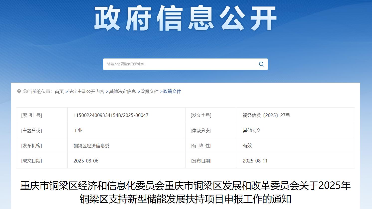 近日,重庆市铜梁区经信委及重庆市铜梁区发改委印发《关于2025年铜梁区支持新型储能发展扶持项目申报工作的通知》。根据申报规则,用户侧储能项目按上一自然年实际储能放电量给予项目投资方0.5元/千瓦时的资金补贴;如果企业在建设储能同时新建光伏设施,按上一自然年光伏实际发电量给予项目投资方0.5元/千瓦时的资金补贴,每年光伏发电量补贴不超过储能放电量补贴,连续补贴三年;两项补贴金额累计不超过1000万元。项目申报时间为2025年8月7日至2025年9月6日。