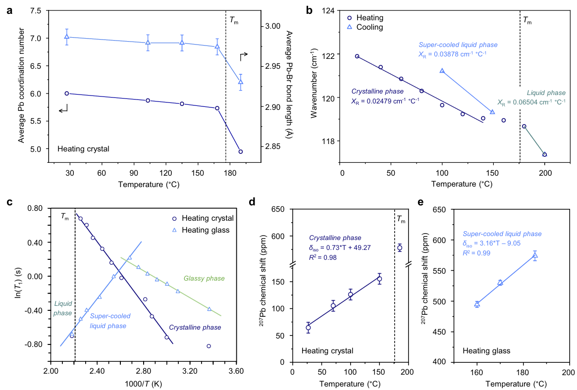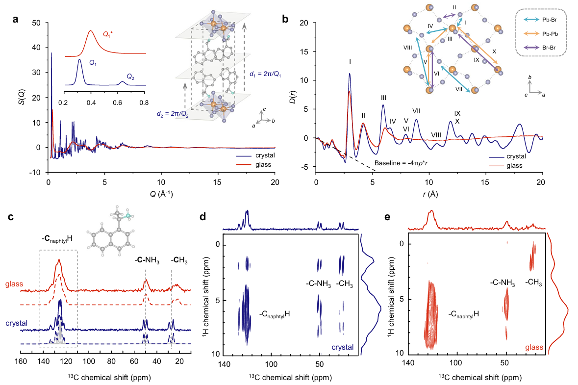 多尺度表征技术:结合同步辐射X射线散射、太赫兹光谱和固态核磁共振,首次完整揭示了HOIP从晶体→液态→玻璃态的结构演化路径。