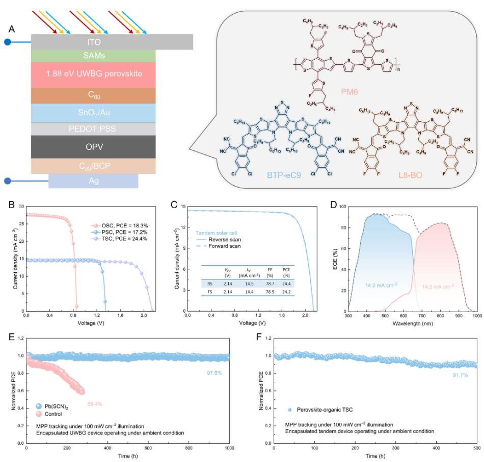 高效稳定器件:引入硫氰酸盐伪卤化物调节剂,显著提升薄膜结晶质量和缺陷钝化效果,单结器件效率达17.2%,串联器件效率突破24.4%,并展现出优异的长期稳定性(1000小时后效率保持98%)。