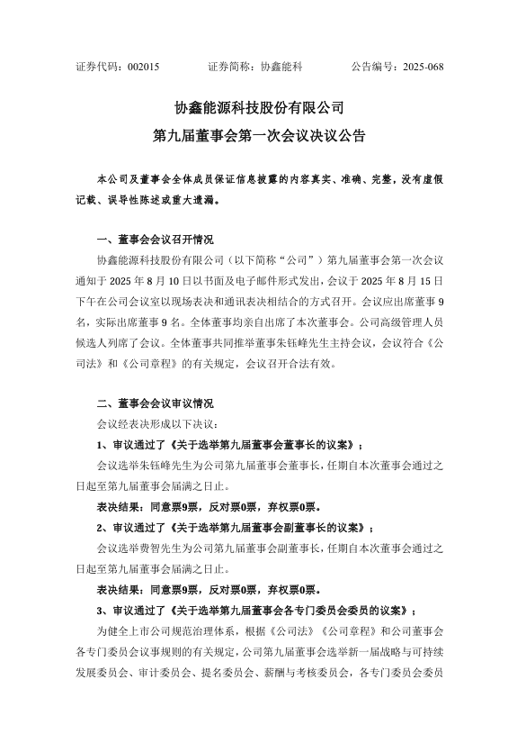 近日,协鑫能科发布第九届董事会第一次会议决议公告。公告指出,朱钰峰先生担任董事长,朱共山、费智任副董事长。朱战军、顾增才、彭毅出任非独立董事。
