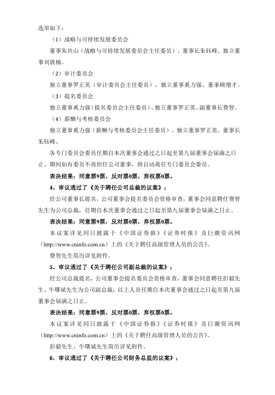 经公司总裁提名,公司董事会提名委员会资格审查,董事会同意聘任彭毅先生、牛曙斌先生为公司副总裁。以上人员任期自本次董事会通过之日起至第九届董事会届满之日止。