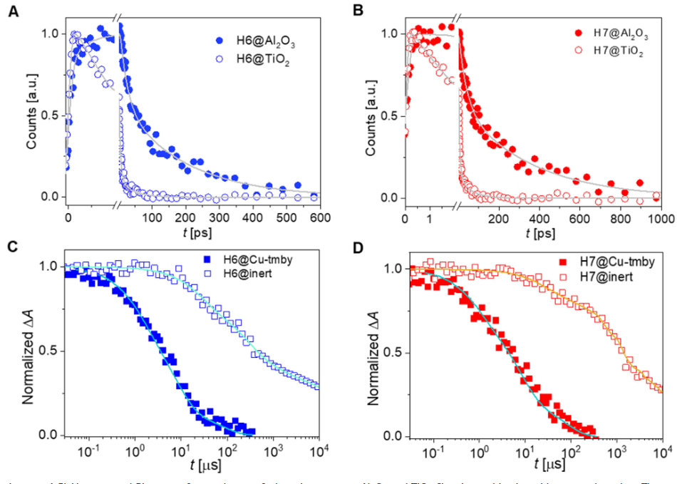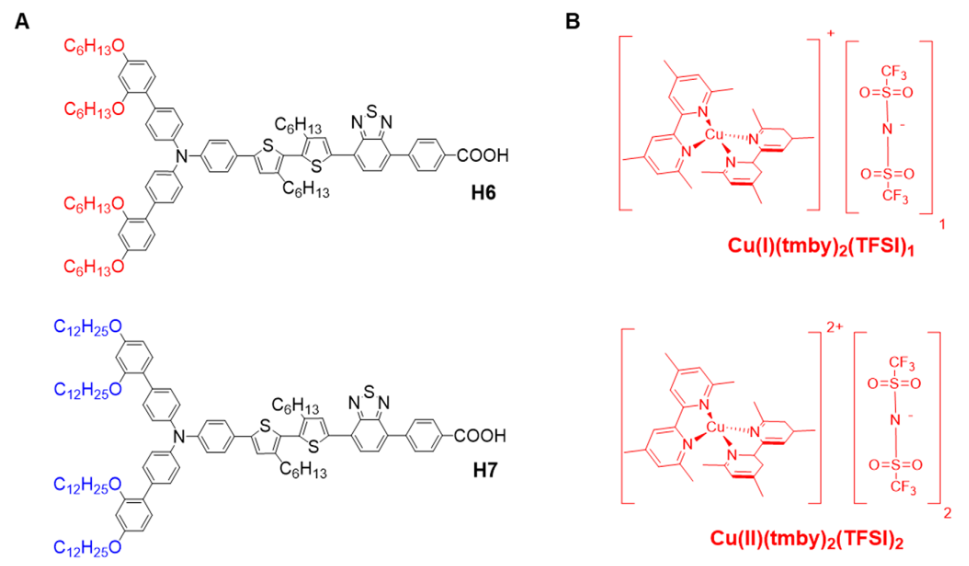 本文西班牙加泰罗尼亚化学研究所Emilio Palomares等人报道了两种有机光敏剂H6和H7,分别采用大体积供体N-(2',4'-双(己氧基)-[1,1'-联苯]-4-基)-2',4'-双(己氧基)-N-甲基-[1,1'-联苯]-4-胺和N-(2',4'-双(十二烷氧基)-[1,1'-联苯]-4-基)-2',4'-双(十二烷氧基)-N-甲基-[1,1'-联苯]-4-胺,以及双己基噻吩作为π桥和电子受体4-(苯并[c][1,2,5]噻二唑-4-基)苯甲酸。尽管更长的烷基链并未改变光学能隙,但H7在染料接枝的二氧化钛和氧化铝薄膜中表现出比H6更长的激发态寿命。采用长烷基链光敏剂H7的铜基DSCs实现了1.22 V的高VocVoc,与近期研究的钙钛矿半导体太阳能电池相当。
