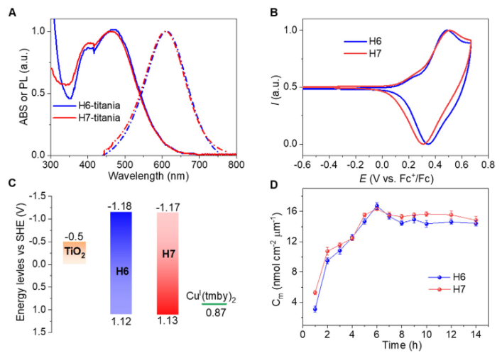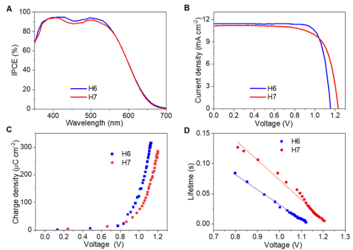 分子结构优化提升性能:通过引入长烷基链(H7为十二烷氧基,H6为己氧基)有效抑制染料分子聚集,延长激发态寿命,显著提升开路电压至1.22 V,并改善电荷分离与传输效率。