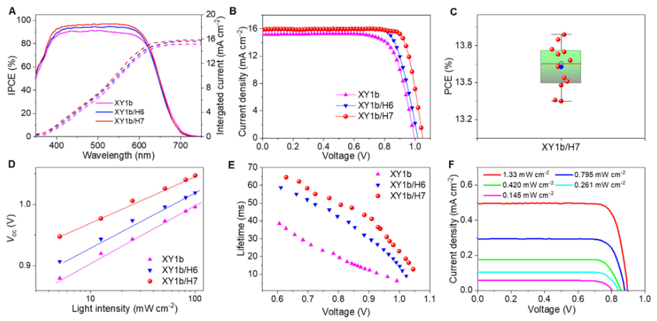 共敏化策略实现高效光捕获:H7与窄带隙染料XY1b共敏化,互补吸收光谱,覆盖400–700 nm范围,IPCE峰值超过90%,最终实现13.7%的PCE(AM1.5G)和29.7%的弱光效率,优于同类钙钛矿器件。