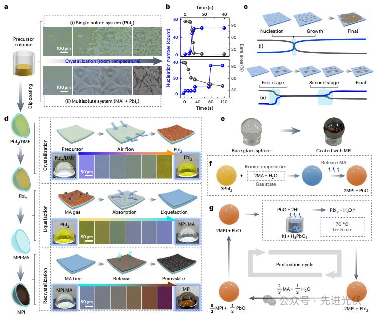 自组装结晶机制:利用PbI₂溶液低能波动驱动的快速成核主导结晶,表面张力使前驱体均匀分散于曲面基底,MA气体诱导固-液-固相变实现致密膜生长。