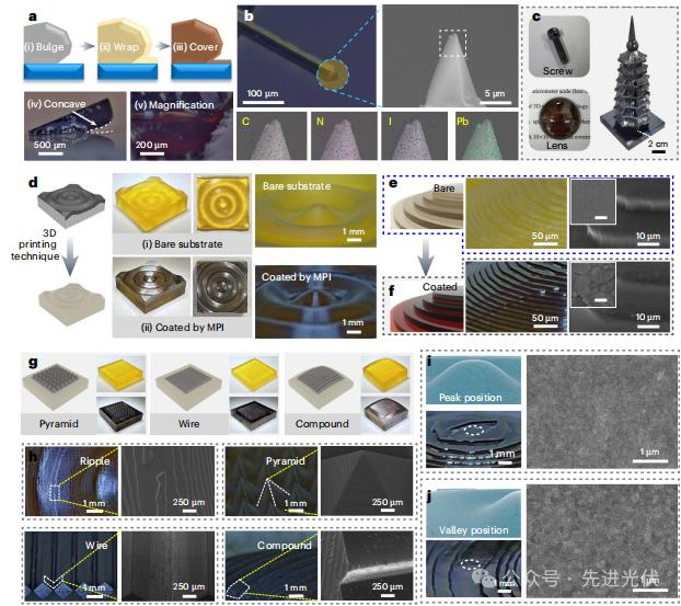 通过不规则凸起、微探针、螺丝等多样化结构,验证了钙钛矿薄膜对复杂几何形貌的普适性覆盖能力。特别展示了3D打印波纹结构模型上薄膜的完整包裹,包括宏观起伏表面和微观层状条纹的双重适应。薄膜厚度扰动控制在20%以内,元素分布图谱证实了化学成分的均匀性。该策略成功实现了从亚微米探针到分米级古塔模型的跨尺度集成,为仿生眼和微谐振器等应用提供了可能。