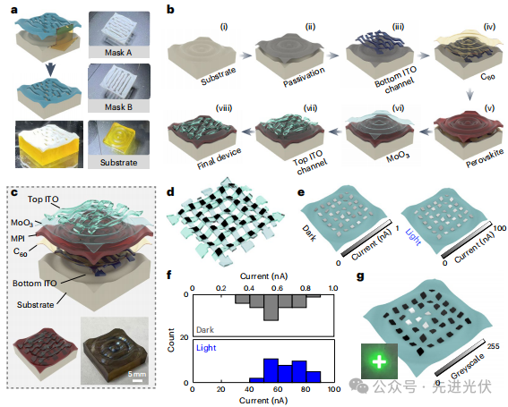 展示通过3D打印掩模在波纹形基底构建垂直光电二极管阵列的全流程。多层结构(ITO/C₆₀/MPI/MoO₃/ITO)形成自供电光二极管,响应时间达2.33μs(上升)和1.35μs(衰减)。阵列在曲面上保持优异均匀性(暗/光电流变异系数<24%),并成功识别"+"形光信号。厚度不敏感窗口设计(扰动<15%)保障了空间变异下的性能稳定,为曲面成像系统奠定基础。