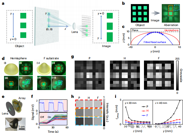 通过光线追踪模拟比较平面、半球和理论焦面(F基底)的像差,显示F基底均方根半径(244.9μm)比半球(420.1μm)降低42%。实际构建的10×10阵列验证了F器件对离轴彗差的校正效果,角落像素信号强度从半球器件的0.48提升至0.88(归一化值)。集成系统演示了终端结构替代复杂光学元件校正像差的新范式。