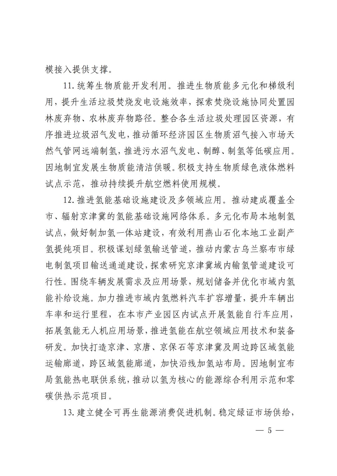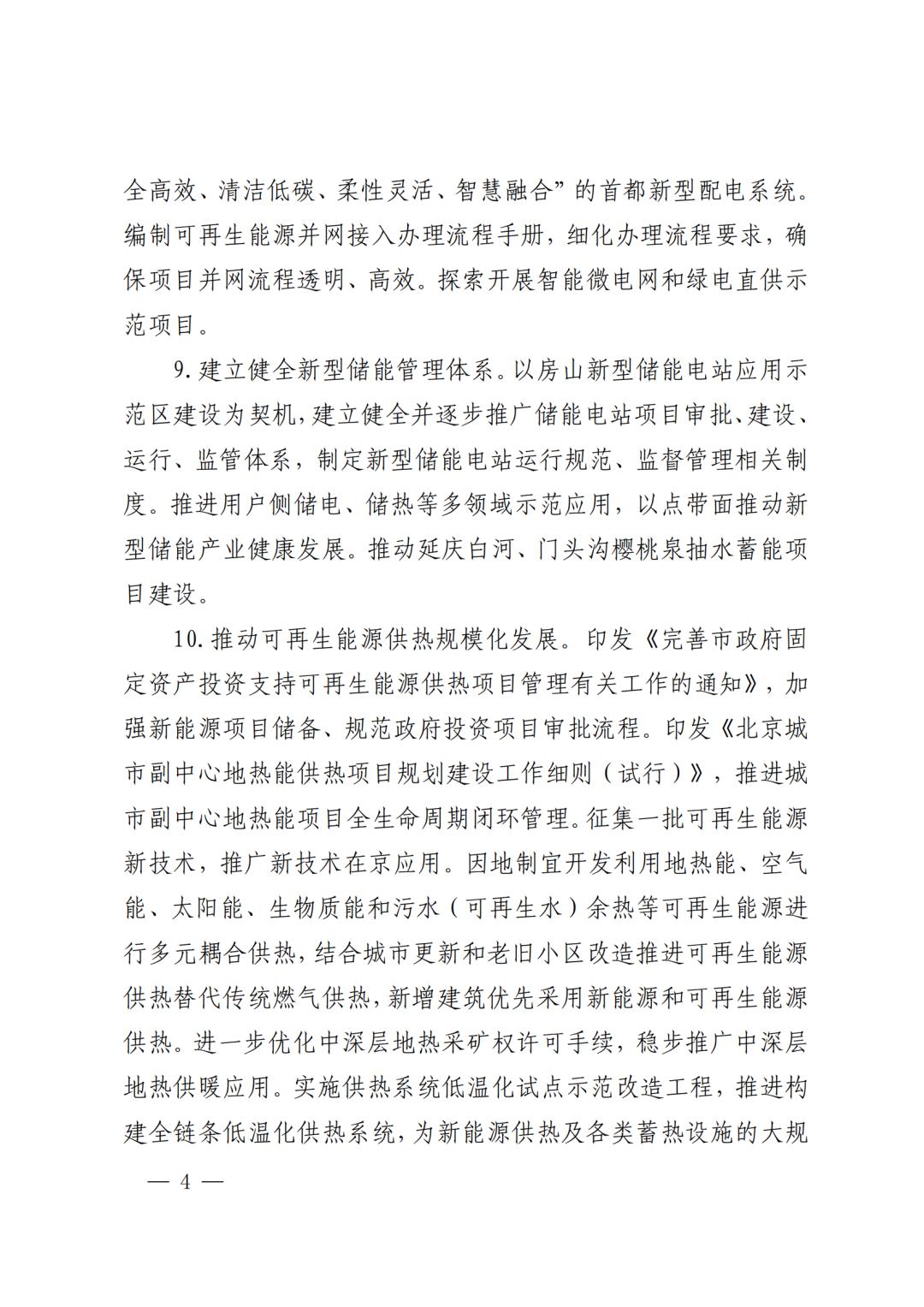 文件指出,提升可再生能源发电装机规模。印发实施《北京市加快推动第五立面光伏应用的若干措施》,加快推动建筑、交通、水务等基础设施第五立面光伏规模化、高水平应用。印发《关于加强风电、光伏发电项目管理工作的通知》,规范风电光伏项目开发建设全流程管理,充分挖掘废弃矿山等未利用地集中式光伏、风电应用潜力。聚焦城市副中心、北京经济技术开发区以及未来科学城能源谷、房山区新型储能示范产业园、大兴区氢能产业园等产业园区和农村地区建设分散式风电项目。