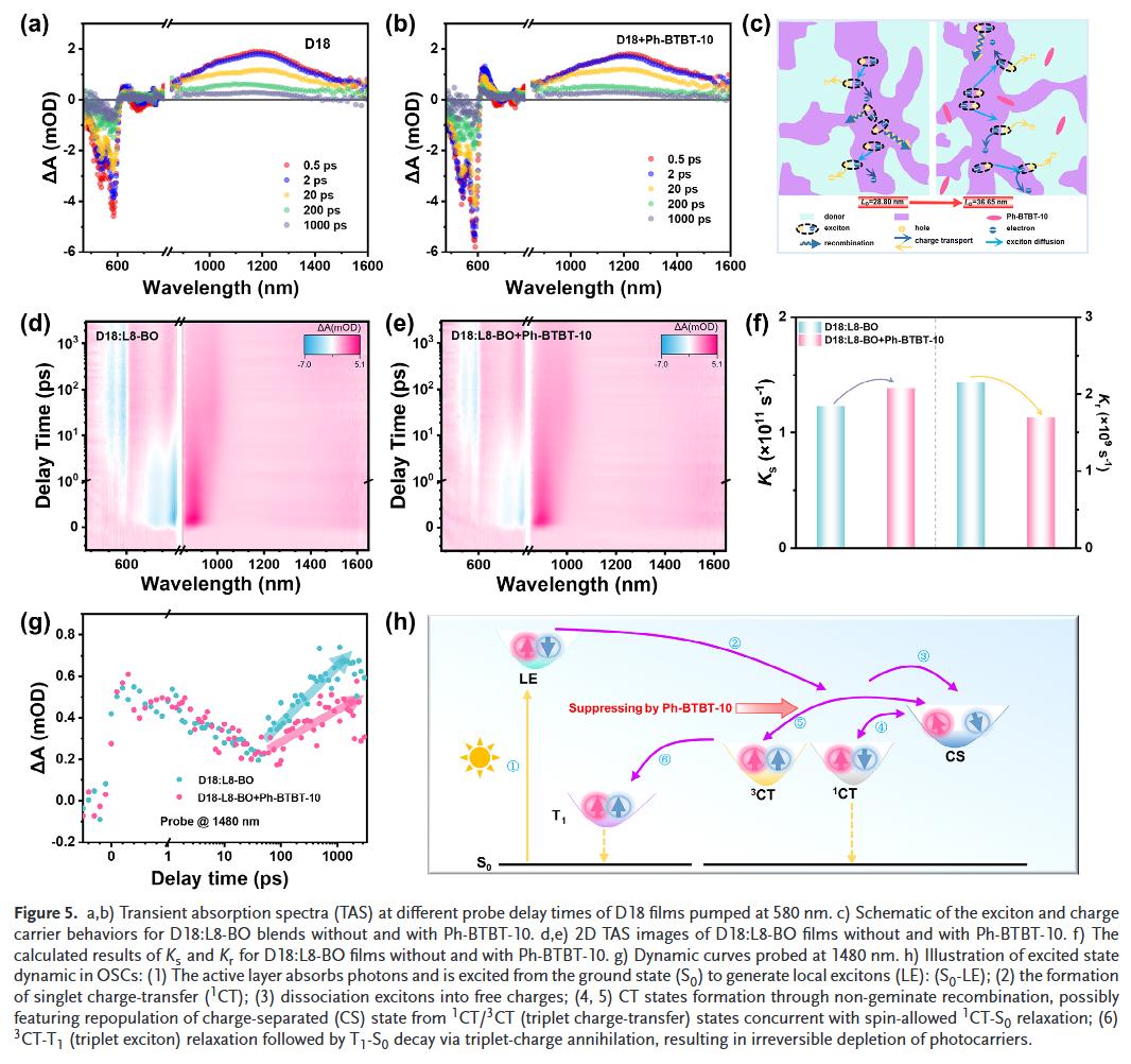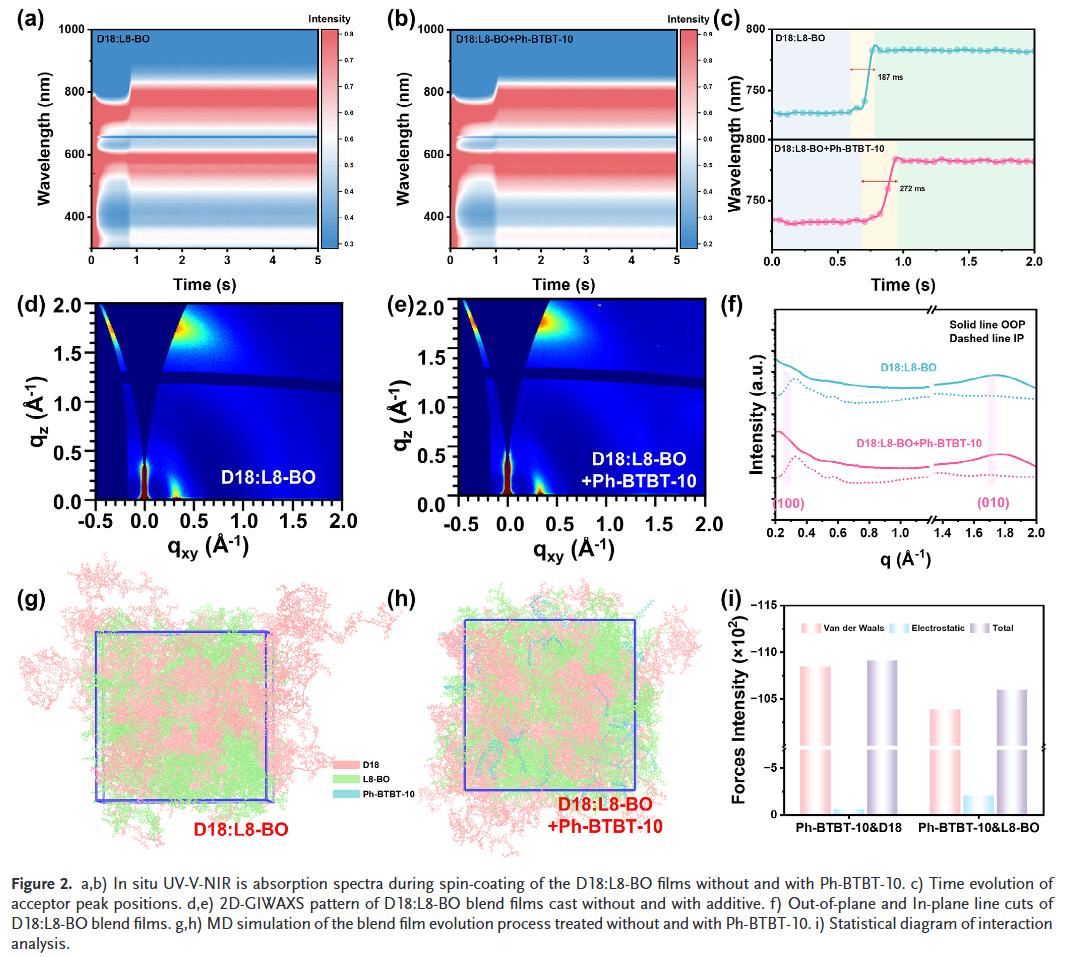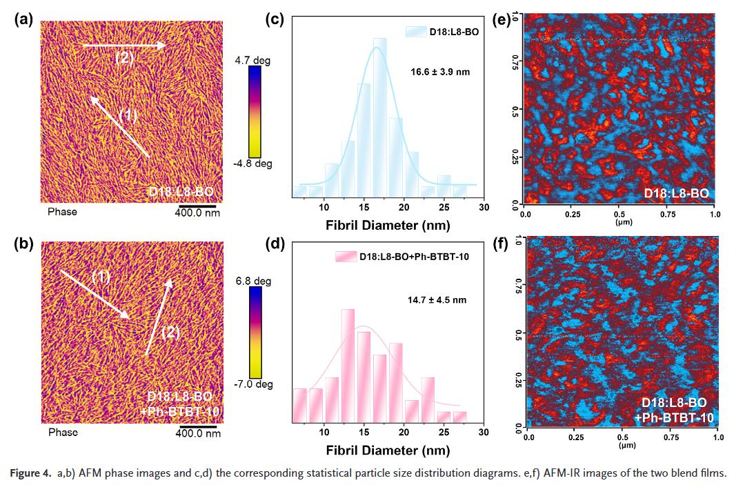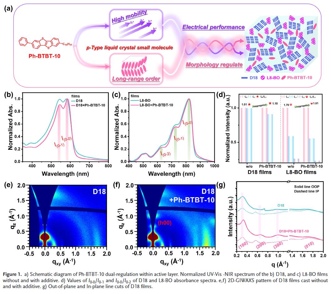 Ph-BTBT-10不仅通过其液晶特性引导D18和L8-BO形成更有序的分子堆叠和双连续纤维网络,还凭借其高本征空穴迁移率提供了额外的电荷传输通道,显著提升器件性能。