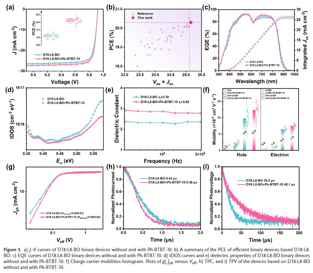 使用Ph-BTBT-10处理的D18:L8-BO二元器件实现了20.3%的PCE,Jₛc和FF均显著提升,且在60°C下900小时后仍保持84%的初始效率,表现出优异的稳定性。