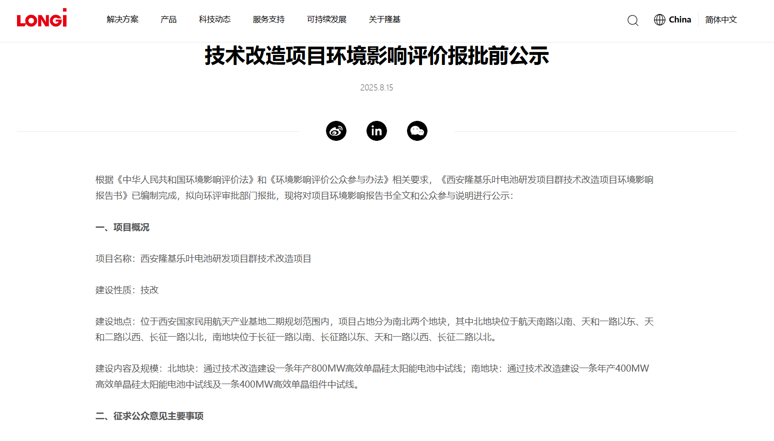 8月15日,隆基绿能官网发布“西安隆基乐叶光伏科技有限公司(以下简称“隆基乐叶”)西安隆基乐叶电池研发项目群技术改造项目环境影响评价报批前公示”。
