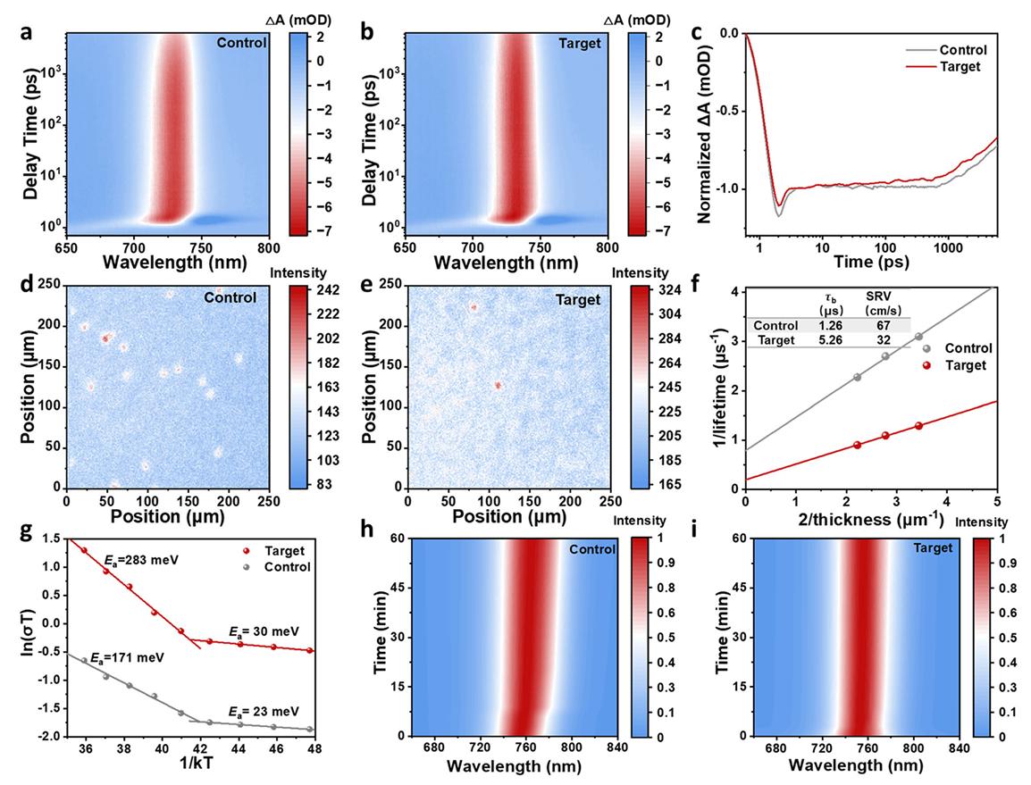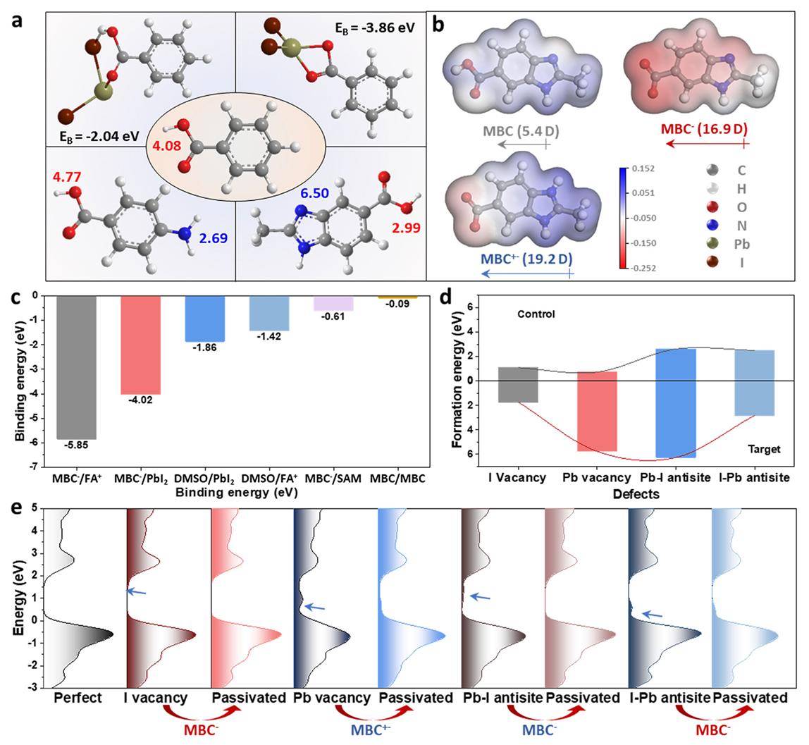基于DFT和酸碱理论设计的MBC分子,兼具羧基(酸性)和咪唑(碱性)官能团,可同时以阴离子和阳离子形式存在,有效钝化钙钛矿中正负电荷缺陷,并调控结晶动力学,显著提升薄膜质量。