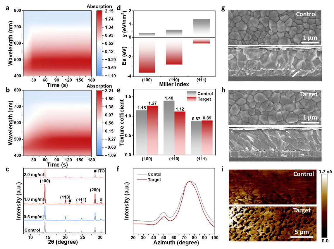 MBC的引入延缓了结晶过程,促进了晶粒择优生长((100)晶面),减少了晶界和缺陷密度,即使在高溴、高铯的宽带隙钙钛矿中也能实现1 μm厚的高质量、无孔洞薄膜,为叠层电池奠定基础。