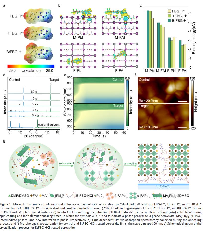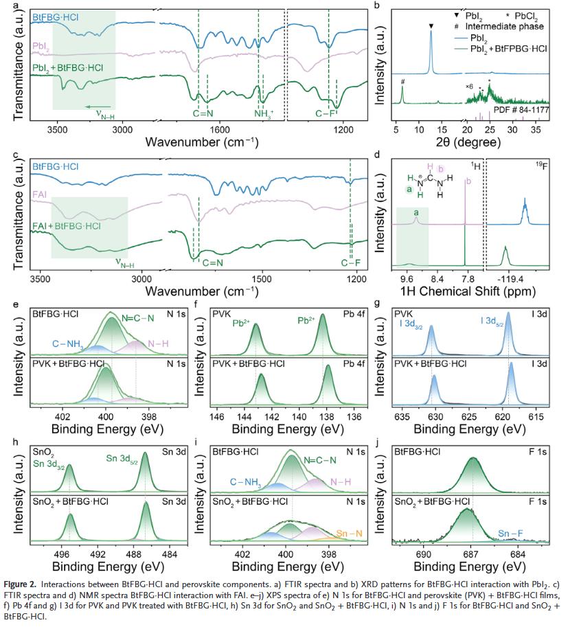 本研究选用一种两亲性分子——1-[3,5-双(三氟甲基)苯基]双胍盐酸盐(BtFBG-HCl),将其引入钙钛矿前驱体中,实现结晶调控、缺陷钝化和界面增韧三重功能。该分子可与钙钛矿组分形成中间相延缓结晶,同时通过正负电基团钝化多种缺陷,获得高质量晶体。此外,BtFBG-HCl在SnO₂与钙钛矿层之间形成强界面桥接,增强器件结构稳定性。