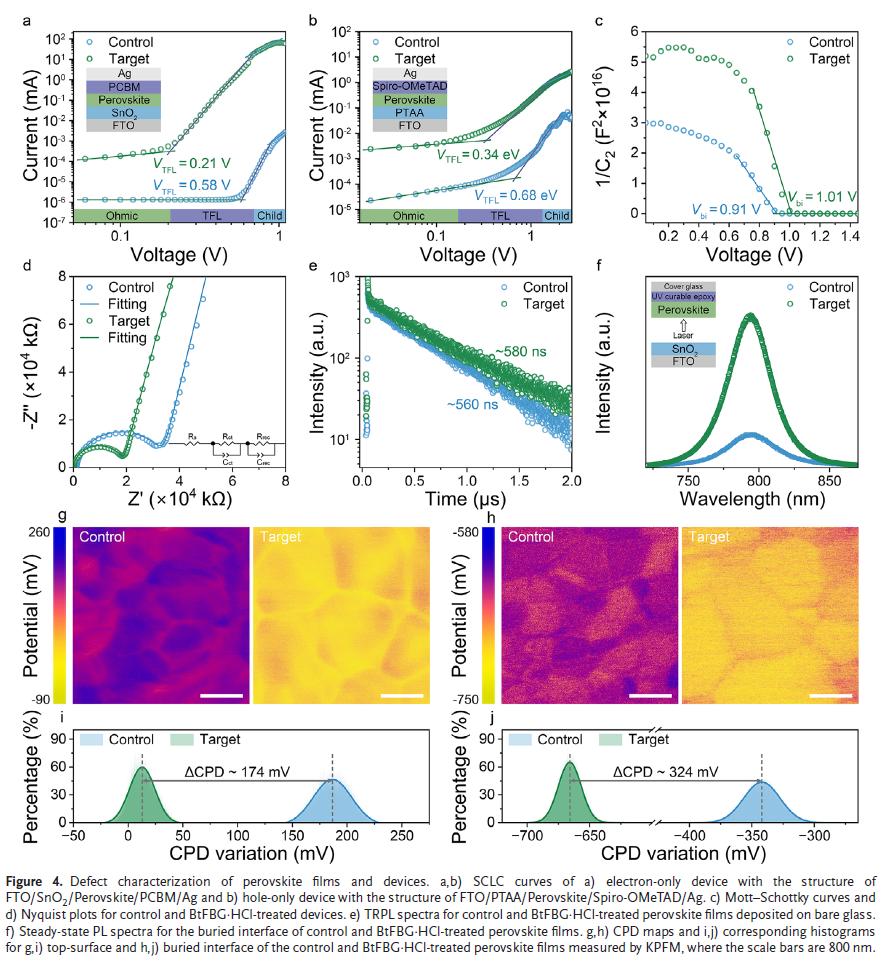 BtFBG-HCl分子同时具备正负电基团,可钝化钙钛矿中正负电荷缺陷,延缓结晶过程,形成高质量大晶粒,显著降低非辐射复合。