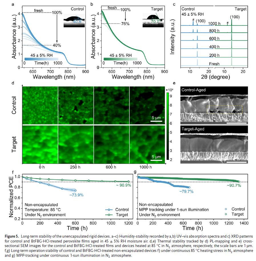 器件在高温、高湿、光照和弯曲等多重应力下均表现出优异稳定性,未封装器件在1330小时MPP追踪后仍保持90%以上效率,柔性器件经历5000次弯曲后效率保持90.1%。