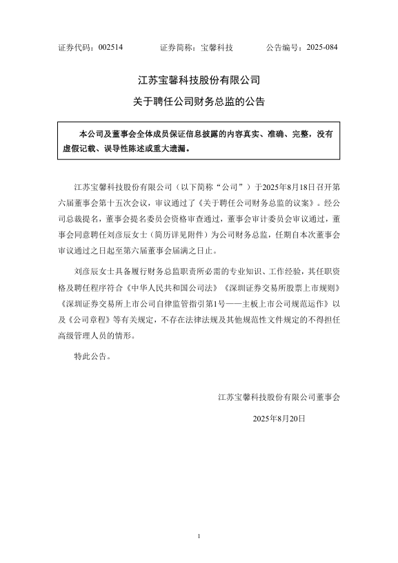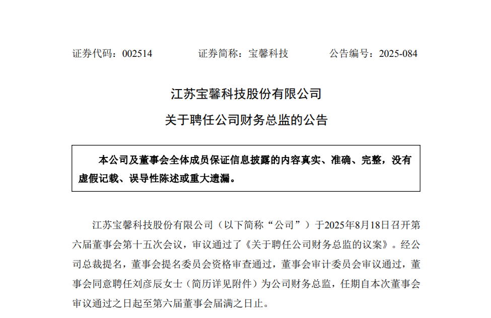 8月20日,宝馨科技发布人事变动公告,聘任刘彦辰为该公司财务总监,任期自本次董事会审议通过之日起至第六届董事会届满之日止。