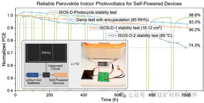 该研究小组在一份新闻稿中表示:“物联网(IoT)的兴起刺激了对自供电器件的需求快速增长,推动了高度兼容的室内光伏 (IPV) 的发展。“PIPV 因其可调带隙和高开路电压而引起了广泛关注。然而,长期稳定性仍然是PIPV商业化的最关键障碍,目前正受到市场的严格审查。