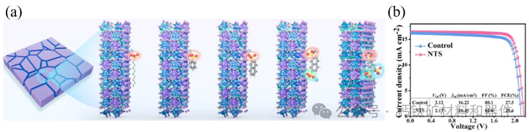 图1 (a) NTS体系添加剂的作用机制;(b) 全钙钛矿叠层太阳能电池器件J-V曲线及其参数