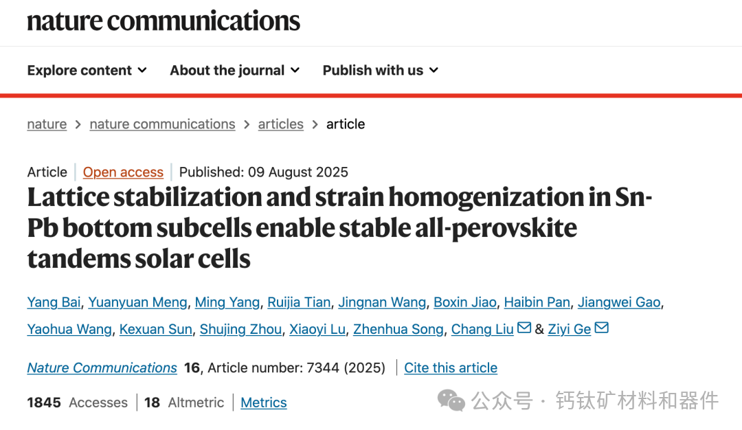 全钙钛矿串联太阳能电池在实现超越单结Shockley–Queisser极限的光电转换效率(PCE)方面展现出巨大潜力。然而,作为全钙钛矿串联器件关键部件的窄带隙锡铅(Sn–Pb)钙钛矿太阳能电池(PSCs),在长期光照下容易出现Sn2+被氧化为Sn4+的现象,伴随离子迁移、晶格应力集中和结构畸变等问题,严重制约了器件的稳定性和效率提升。