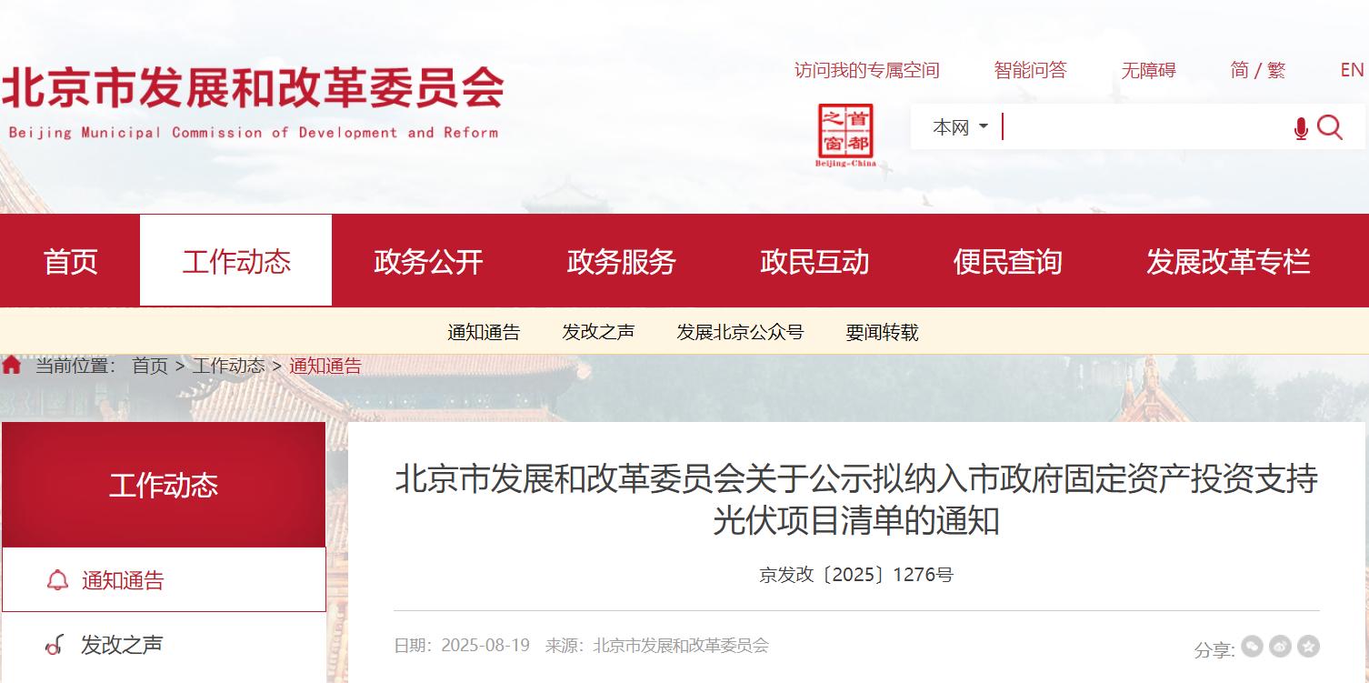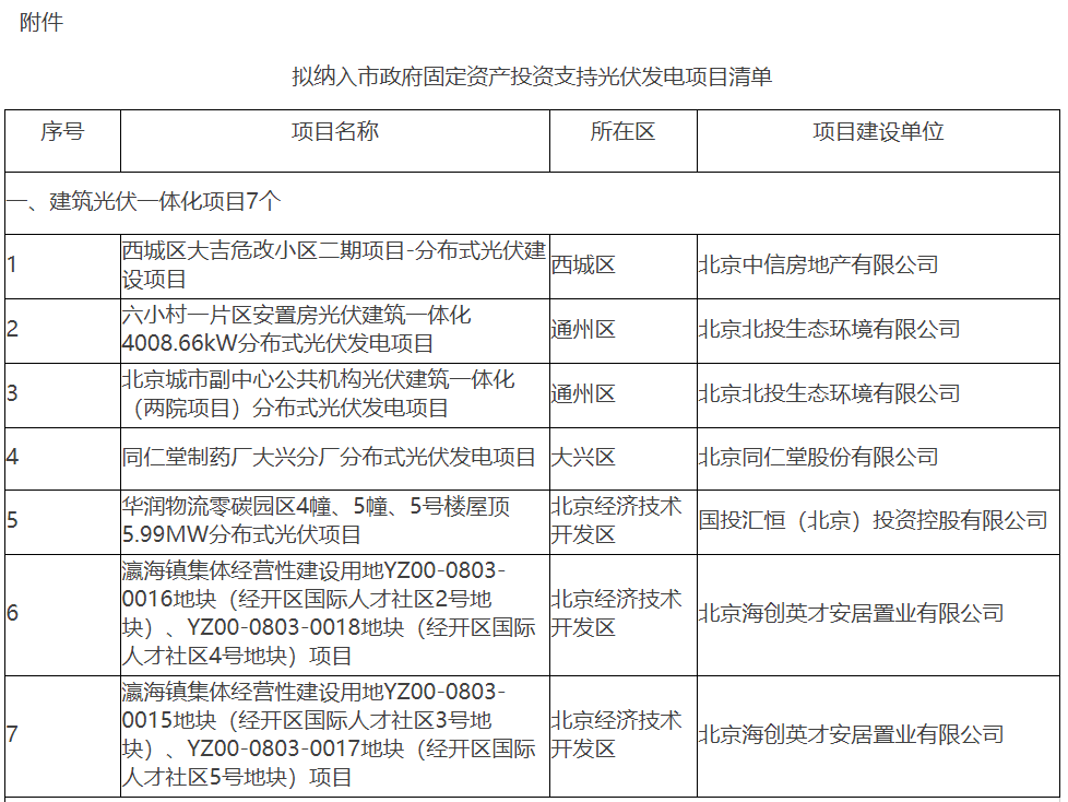 8月19日,北京市发改委公示拟纳入市政府固定资产投资支持光伏项目清单,共有46个光伏发电项目拟纳入市政府固定资产投资支持范围。经公开征集,并组织第三方评估,现对拟纳入市政府固定资产投资支持范围的46个光伏发电项目(见附件)进行公示,公示时间为2025年8月20日-2025年8月26日(5个工作日)。