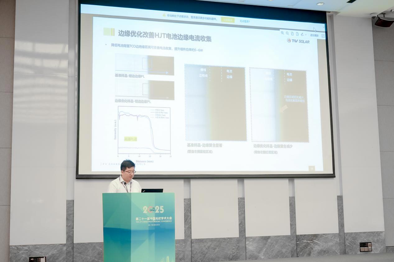 龙巍博士在大会中作主题演讲,并受邀主持分会场。在《面向780瓦的硅异质结太阳电池组件技术路线图》演讲中,龙巍博士分享了通威在异质结电池及组件方面的最新研究成果,并表示,通威提出双面微晶提效、铜互连“革银子的命”、908组件产品“三板斧”的破局路径,不断提高HJT产品的竞争力。同时,公司在HJT电池端的背面抛光、差异化绒面、边缘优化等技术上不断研发,在组件研发端积极导入多分片、全面屏等前沿技术,为2025年底实现780W目标提供强有力支撑。