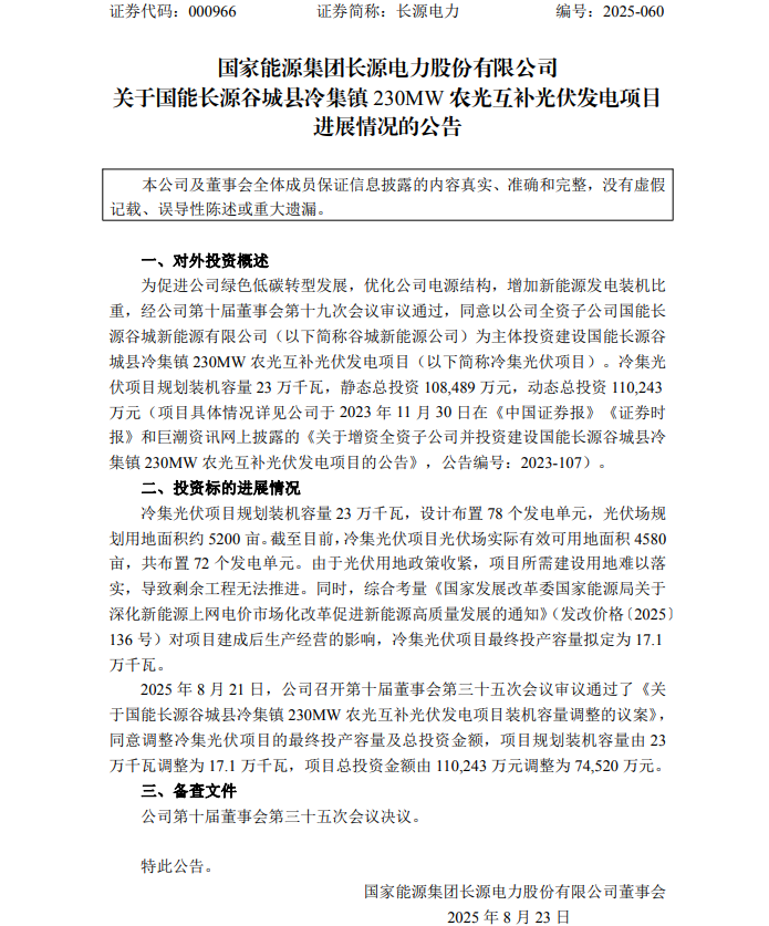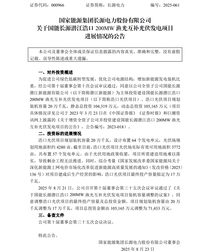 长源电力表示,由于光伏用地政策收紧,项目所需建设用地难以落实,导致剩余工程无法推进。同时,综合考量《国家发展改革委国家能源局关于深化新能源上网电价市场化改革促进新能源高质量发展的通知》(发改价格〔2025〕136 号)对项目建成后生产经营的影响,浩口光伏项目最终投产容量拟定为 17 万千瓦,冷集光伏项目最终投产容量拟定为 17.1万千瓦。