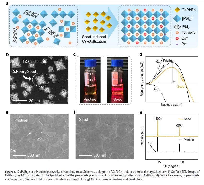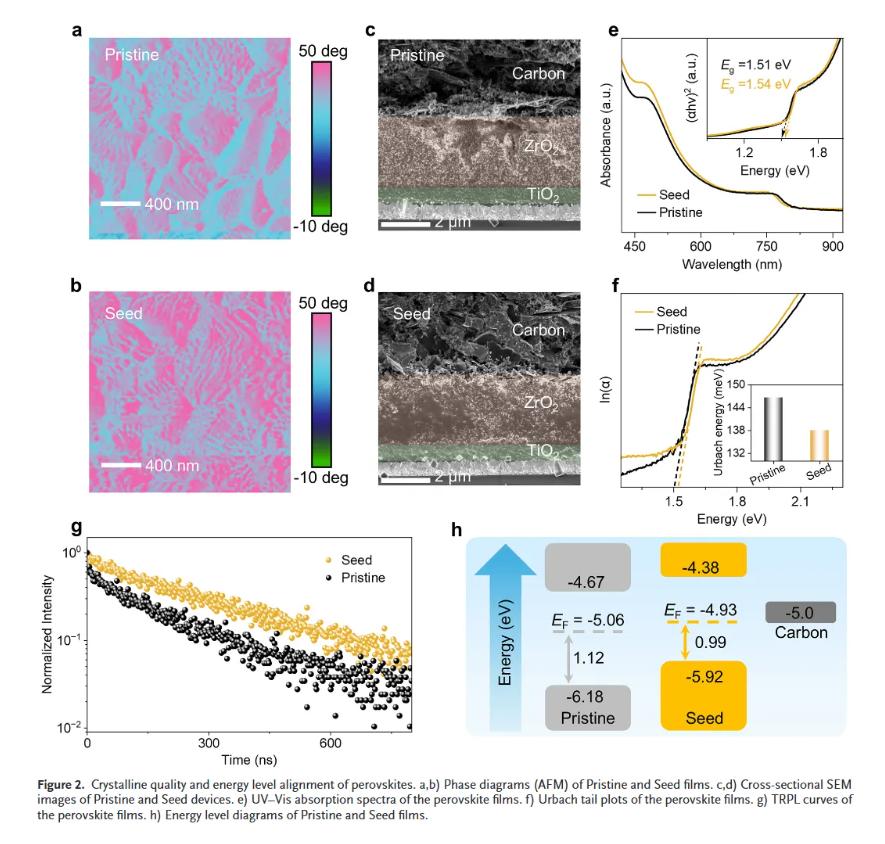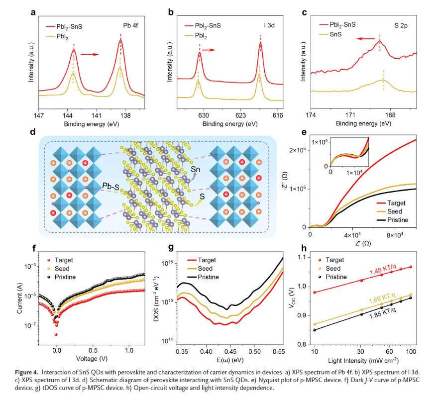 通过预嵌入CsPbBr₃晶种促进大晶粒钙钛矿生长,并结合SnS QD形成II型异质结,协同优化结晶质量和界面能级对齐,显著降低缺陷密度和载流子复合。